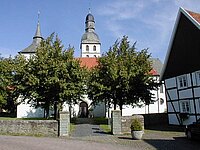 Die Kirche besaß von Anfang an einen Turm mit Glocken. Das hoch aufragende Kreuz sollte anzeigen, das der Prediger umsonst redet, wenn ihm nicht der Glaube an einen Mittler, Christus, zur Seite steht. Der Hahn, seit dem 10. Jahrhundert gibt es diesen Brauch, spielt auf den Verrat des Petrus an. Er könnte aber auch an die Verpflichtung des Predigers erinnern, die Schläfer aus dem Sündenschlaf zu rütteln.